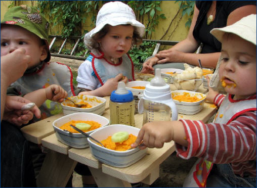 Neben dem Mittagessen bieten wir Frühstück und einen Snack am Nachmittag. Alle Kinder können auch außerhalb der Essenszeiten etwas zu essen bekommen. Den ganzen Tag über stehen ungesüßte Getränke (Wasser, Tee, gelegentlich verdünnte ungesüßte Fruchtsäfte) zur Verfügung. Es wird darauf geachtet, dass die Kinder ausreichend Flüssigkeit zu sich nehmen.